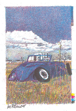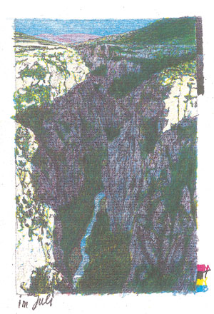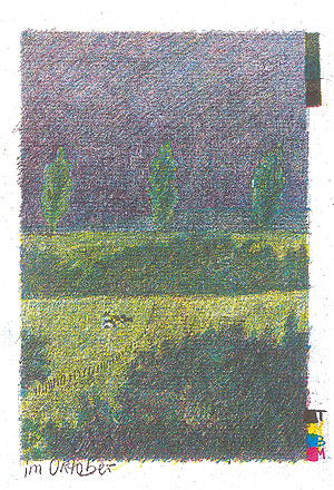 Separationen sind eine von mir entwickelte Methode der Farbtrennung und der Druckvorlagenherstellung nach lithografischen Vorbild. Die Farbauszüge werden mit Bleistift unterschiedlicher Weichheit oder Härte passgenau direkt auf Transparentpapier gezeichnet – in den jeweils vorgesehenen Farben, z.B. Cyan, Magenta, Yellow und Tiefe. Das Transparentpapier übernimmt die Funktion des gekörnten Lithosteines. Besonders spannend wird das Verfahren, wenn man die Farbtrennungen direkt vor Ort in der freien Natur zeichnet. Die Farben werden in „Schwarz-Weiß“ tonwertig gezeichnet und dann zu Hause per Kontaktrahmen direkt auf Film kopiert. Ohne jegliche technische Rasterung oder sonstige Manipulation. Deshalb nenne ich das Verfahren auch „Spontanlithografie im Direktverfahren“. (siehe auch die