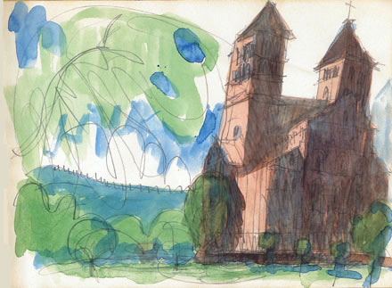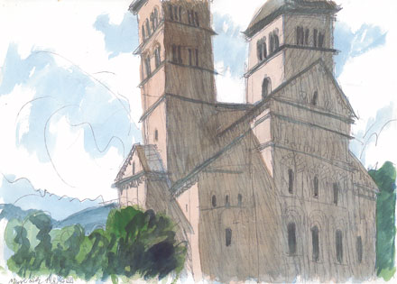 Im Elsaß gibt es neben der „Weinstraße“ auch eine „Romanische Straße“, auf deren Verlauf man die schönsten Bauten aus dem 11/12. Jahrhundert sehen kann. Fortsetzung findet diese Straße dann in der Pfalz mit dem Kaiserdom in Speyer und dem Dom in Worms bzw. Mainz und weiteren Kirchenbauten. Langobardische Baumeister haben auf dem Weg von Italien nach Norden ihre Baukunst manifestiert. Ich habe mit den beiden Skizzen in Rosheim und Murbach einen Anfang gemacht, um diese besonderen Architekturmotive einzufangen. Und Lothringen ist schon immer meine Heimat. Langsam muss ich mich ihr nähern. In Metz habe ich damit begonnen.